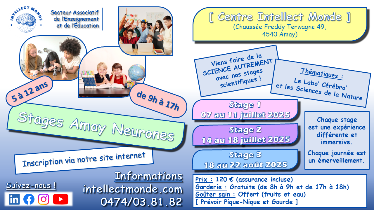 Nous vous accueillons à notre espace éducatif au [ Centre Intellect Monde ] – Chaussée Freddy Terwagne 49 à 4540 Amay, de 8h à 18h lors de nos stages.